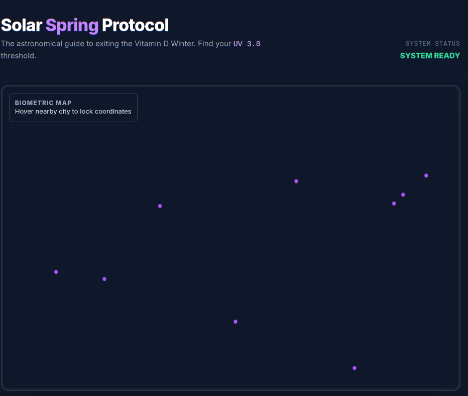 There will be a first day of the year when you can get vitamin d, this will be exactly at solar noon and you can easily find out when this is by googling “uv index $mycity”. I wanted to make a map so the information on your solar noon (it can by off of official noon by an hour+daylight saving bullshit, if your aiming for the first 15 minutes that matters)